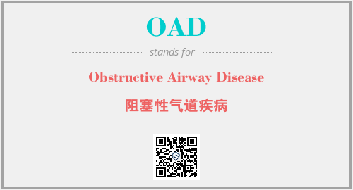 上述内容是“Obstructive Airway Disease”作为“OAD”的缩写,解释为“阻塞性气道疾病”时的信息,以及英文缩略词OAD所代表的英文单词,其对应的中文拼音、详细解释以及在英文中的流行度和相关分类、应用领域及应用示例等。