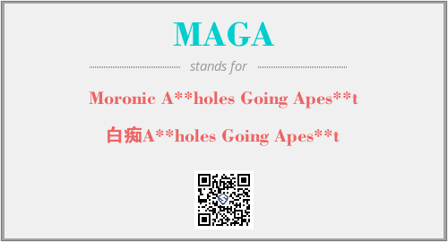 英文缩略词“MAGA”经常作为“Moronic A**holes Going Apes**t”的英文缩写来使用,中文表示:“白痴A**holes Going Apes**t”。本文将详细介绍英文缩写词MAGA所代表英文单词,其对应的中文拼音、详细解释以及在英语中的流行度。此外,还有关于缩略词MAGA的分类、应用领域及相关应用示例等。