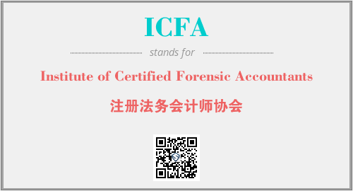 上述内容是“Institute of Certified Forensic Accountants”作为“ICFA”的缩写,解释为“注册法务会计师协会”时的信息,以及英文缩略词ICFA所代表的英文单词,其对应的中文拼音、详细解释以及在英文中的流行度和相关分类、应用领域及应用示例等。