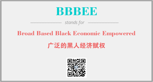英文缩略词“BBBEE”经常作为“Broad Based Black Economic Empowered”的英文缩写来使用,中文表示:“广泛的黑人经济赋权”。本文将详细介绍英文缩写词BBBEE所代表英文单词,其对应的中文拼音、详细解释以及在英语中的流行度。此外,还有关于缩略词BBBEE的分类、应用领域及相关应用示例等。
