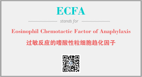 上述内容是“Eosinophil Chemotactic Factor of Anaphylaxis”作为“ECFA”的缩写,解释为“过敏反应的嗜酸性粒细胞趋化因子”时的信息,以及英文缩略词ECFA所代表的英文单词,其对应的中文拼音、详细解释以及在英文中的流行度和相关分类、应用领域及应用示例等。