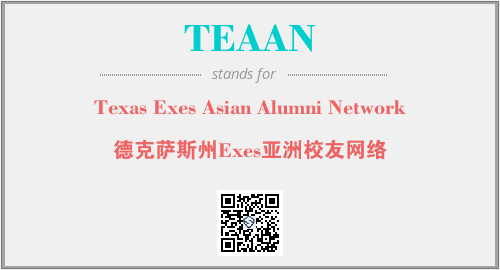 上述内容是“Texas Exes Asian Alumni Network”作为“TEAAN”的缩写,解释为“德克萨斯州Exes亚洲校友网络”时的信息,以及英文缩略词TEAAN所代表的英文单词,其对应的中文拼音、详细解释以及在英文中的流行度和相关分类、应用领域及应用示例等。