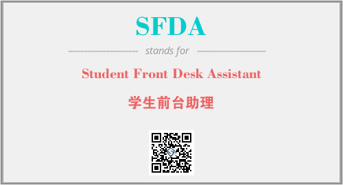 英文缩略词“SFDA”经常作为“Student Front Desk Assistant”的英文缩写来使用,中文表示:“学生前台助理”。本文将详细介绍英文缩写词SFDA所代表英文单词,其对应的中文拼音、详细解释以及在英语中的流行度。此外,还有关于缩略词SFDA的分类、应用领域及相关应用示例等。