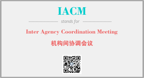 英文缩略词“IACM”经常作为“Inter Agency Coordination Meeting”的英文缩写来使用,中文表示:“机构间协调会议”。本文将详细介绍英文缩写词IACM所代表英文单词,其对应的中文拼音、详细解释以及在英语中的流行度。此外,还有关于缩略词IACM的分类、应用领域及相关应用示例等。
