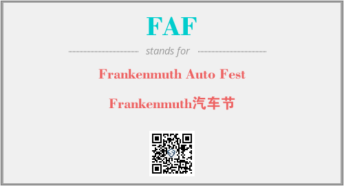 上述内容是“Frankenmuth Auto Fest”作为“FAF”的缩写,解释为“Frankenmuth汽车节”时的信息,以及英文缩略词FAF所代表的英文单词,其对应的中文拼音、详细解释以及在英文中的流行度和相关分类、应用领域及应用示例等。