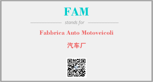 上述内容是“Fabbrica Auto Motoveicoli”作为“FAM”的缩写,解释为“汽车厂”时的信息,以及英文缩略词FAM所代表的英文单词,其对应的中文拼音、详细解释以及在英文中的流行度和相关分类、应用领域及应用示例等。