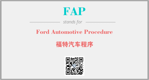 上述内容是“Ford Automotive Procedure”作为“FAP”的缩写,解释为“福特汽车程序”时的信息,以及英文缩略词FAP所代表的英文单词,其对应的中文拼音、详细解释以及在英文中的流行度和相关分类、应用领域及应用示例等。