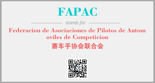 上述内容是“Federacion de Asociaciones de Pilotos de Automoviles de Competicion”作为“FAPAC”的缩写,解释为“赛车手协会联合会”时的信息,以及英文缩略词FAPAC所代表的英文单词,其对应的中文拼音、详细解释以及在英文中的流行度和相关分类、应用领域及应用示例等。