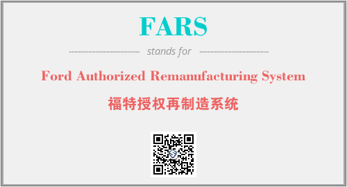上述内容是“Ford Authorized Remanufacturing System”作为“FARS”的缩写,解释为“福特授权再制造系统”时的信息,以及英文缩略词FARS所代表的英文单词,其对应的中文拼音、详细解释以及在英文中的流行度和相关分类、应用领域及应用示例等。