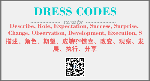 "DRESS CODES - 描述、角色、期望、成功、惊喜、改变、观察、发展、执行、分享 ." [引用日期]. <https://www.suoxie123.com/a/105055.html>.
