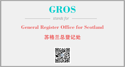 英文缩略词“GROS”经常作为“General Register Office for Scotland”的英文缩写来使用,中文表示:“苏格兰总登记处”。本文将详细介绍英文缩写词GROS所代表英文单词,其对应的中文拼音、详细解释以及在英语中的流行度。此外,还有关于缩略词GROS的分类、应用领域及相关应用示例等。