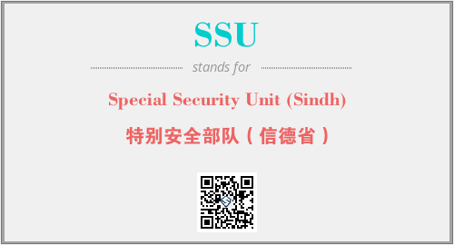 上述内容是“Special Security Unit (Sindh)”作为“SSU”的缩写,解释为“特别安全部队(信德省)”时的信息,以及英文缩略词SSU所代表的英文单词,其对应的中文拼音、详细解释以及在英文中的流行度和相关分类、应用领域及应用示例等。