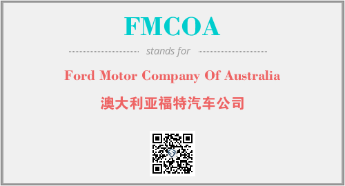 英文缩略词“FMCOA”经常作为“Ford Motor Company Of Australia”的英文缩写来使用,中文表示:“澳大利亚福特汽车公司”。本文将详细介绍英文缩写词FMCOA所代表英文单词,其对应的中文拼音、详细解释以及在英语中的流行度。此外,还有关于缩略词FMCOA的分类、应用领域及相关应用示例等。