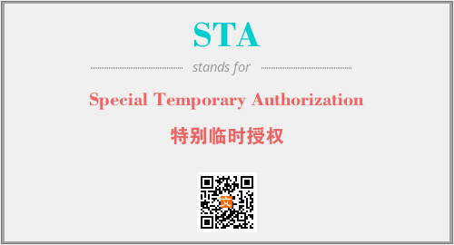 英文缩略词“STA”经常作为“Special Temporary Authorization”的英文缩写来使用,中文表示:“特别临时授权”。本文将详细介绍英文缩写词STA所代表英文单词,其对应的中文拼音、详细解释以及在英语中的流行度。此外,还有关于缩略词STA的分类、应用领域及相关应用示例等。