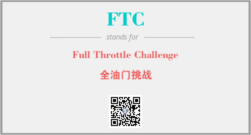 上述内容是“Full Throttle Challenge”作为“FTC”的缩写,解释为“全油门挑战”时的信息,以及英文缩略词FTC所代表的英文单词,其对应的中文拼音、详细解释以及在英文中的流行度和相关分类、应用领域及应用示例等。