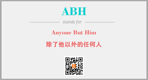 上述内容是“Anyone But Him”作为“ABH”的缩写,解释为“除了他以外的任何人”时的信息,以及英文缩略词ABH所代表的英文单词,其对应的中文拼音、详细解释以及在英文中的流行度和相关分类、应用领域及应用示例等。