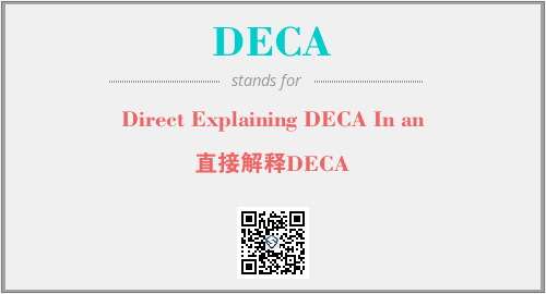 英文缩略词“DECA”经常作为“Direct Explaining DECA In an”的英文缩写来使用,中文表示:“直接解释DECA”。本文将详细介绍英文缩写词DECA所代表英文单词,其对应的中文拼音、详细解释以及在英语中的流行度。此外,还有关于缩略词DECA的分类、应用领域及相关应用示例等。