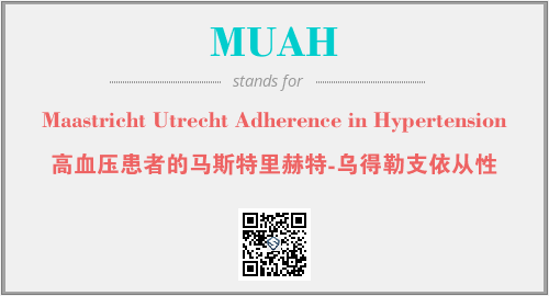上述内容是“Maastricht Utrecht Adherence in Hypertension”作为“MUAH”的缩写,解释为“高血压患者的马斯特里赫特-乌得勒支依从性”时的信息,以及英文缩略词MUAH所代表的英文单词,其对应的中文拼音、详细解释以及在英文中的流行度和相关分类、应用领域及应用示例等。