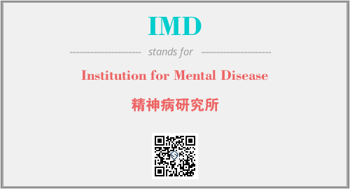 上述内容是“Institution for Mental Disease”作为“IMD”的缩写,解释为“精神病研究所”时的信息,以及英文缩略词IMD所代表的英文单词,其对应的中文拼音、详细解释以及在英文中的流行度和相关分类、应用领域及应用示例等。
