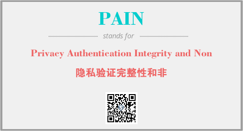 上述内容是“Privacy Authentication Integrity and Non”作为“PAIN”的缩写,解释为“隐私验证完整性和非”时的信息,以及英文缩略词PAIN所代表的英文单词,其对应的中文拼音、详细解释以及在英文中的流行度和相关分类、应用领域及应用示例等。