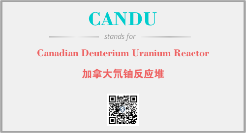英文缩略词“CANDU”经常作为“Canadian Deuterium Uranium Reactor”的英文缩写来使用,中文表示:“加拿大氘铀反应堆”。本文将详细介绍英文缩写词CANDU所代表英文单词,其对应的中文拼音、详细解释以及在英语中的流行度。此外,还有关于缩略词CANDU的分类、应用领域及相关应用示例等。