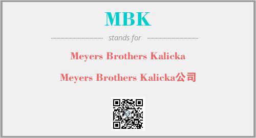 上述内容是“Meyers Brothers Kalicka”作为“MBK”的缩写,解释为“Meyers Brothers Kalicka公司”时的信息,以及英文缩略词MBK所代表的英文单词,其对应的中文拼音、详细解释以及在英文中的流行度和相关分类、应用领域及应用示例等。