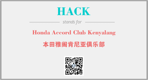 英文缩略词“HACK”经常作为“Honda Accord Club Kenyalang”的英文缩写来使用,中文表示:“本田雅阁肯尼亚俱乐部”。本文将详细介绍英文缩写词HACK所代表英文单词,其对应的中文拼音、详细解释以及在英语中的流行度。此外,还有关于缩略词HACK的分类、应用领域及相关应用示例等。