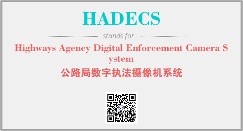 上述内容是“Highways Agency Digital Enforcement Camera System”作为“HADECS”的缩写,解释为“公路局数字执法摄像机系统”时的信息,以及英文缩略词HADECS所代表的英文单词,其对应的中文拼音、详细解释以及在英文中的流行度和相关分类、应用领域及应用示例等。