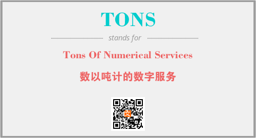 英文缩略词“TONS”经常作为“Tons Of Numerical Services”的英文缩写来使用,中文表示:“数以吨计的数字服务”。本文将详细介绍英文缩写词TONS所代表英文单词,其对应的中文拼音、详细解释以及在英语中的流行度。此外,还有关于缩略词TONS的分类、应用领域及相关应用示例等。