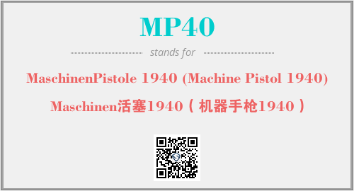 上述内容是“MaschinenPistole 1940 (Machine Pistol 1940)”作为“MP40”的缩写,解释为“Maschinen活塞1940(机器手枪1940)”时的信息,以及英文缩略词MP40所代表的英文单词,其对应的中文拼音、详细解释以及在英文中的流行度和相关分类、应用领域及应用示例等。