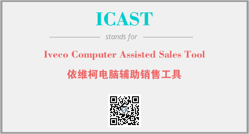 英文缩略词“ICAST”经常作为“Iveco Computer Assisted Sales Tool”的英文缩写来使用,中文表示:“依维柯电脑辅助销售工具”。本文将详细介绍英文缩写词ICAST所代表英文单词,其对应的中文拼音、详细解释以及在英语中的流行度。此外,还有关于缩略词ICAST的分类、应用领域及相关应用示例等。