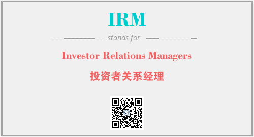 上述内容是“Investor Relations Managers”作为“IRM”的缩写,解释为“投资者关系经理”时的信息,以及英文缩略词IRM所代表的英文单词,其对应的中文拼音、详细解释以及在英文中的流行度和相关分类、应用领域及应用示例等。