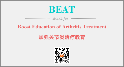 上述内容是“Boost Education of Arthritis Treatment”作为“BEAT”的缩写,解释为“加强关节炎治疗教育”时的信息,以及英文缩略词BEAT所代表的英文单词,其对应的中文拼音、详细解释以及在英文中的流行度和相关分类、应用领域及应用示例等。