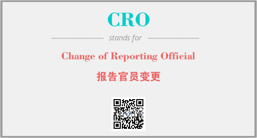 英文缩略词“CRO”经常作为“Change of Reporting Official”的英文缩写来使用,中文表示:“报告官员变更”。本文将详细介绍英文缩写词CRO所代表英文单词,其对应的中文拼音、详细解释以及在英语中的流行度。此外,还有关于缩略词CRO的分类、应用领域及相关应用示例等。