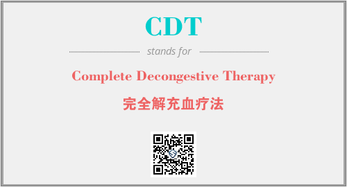 上述内容是“Complete Decongestive Therapy”作为“CDT”的缩写,解释为“完全解充血疗法”时的信息,以及英文缩略词CDT所代表的英文单词,其对应的中文拼音、详细解释以及在英文中的流行度和相关分类、应用领域及应用示例等。