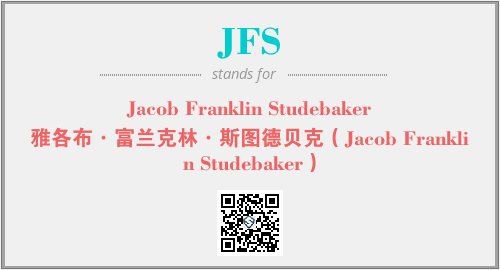 上述内容是“Jacob Franklin Studebaker”作为“JFS”的缩写,解释为“雅各布·富兰克林·斯图德贝克(Jacob Franklin Studebaker)”时的信息,以及英文缩略词JFS所代表的英文单词,其对应的中文拼音、详细解释以及在英文中的流行度和相关分类、应用领域及应用示例等。