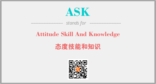 英文缩略词“ASK”经常作为“Attitude Skill And Knowledge”的英文缩写来使用,中文表示:“态度技能和知识”。本文将详细介绍英文缩写词ASK所代表英文单词,其对应的中文拼音、详细解释以及在英语中的流行度。此外,还有关于缩略词ASK的分类、应用领域及相关应用示例等。