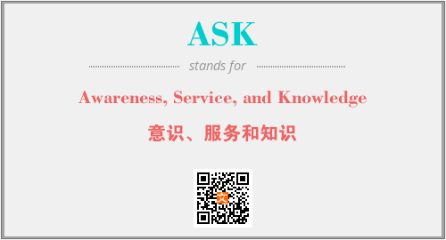 上述内容是“Awareness, Service, and Knowledge”作为“ASK”的缩写,解释为“意识、服务和知识”时的信息,以及英文缩略词ASK所代表的英文单词,其对应的中文拼音、详细解释以及在英文中的流行度和相关分类、应用领域及应用示例等。