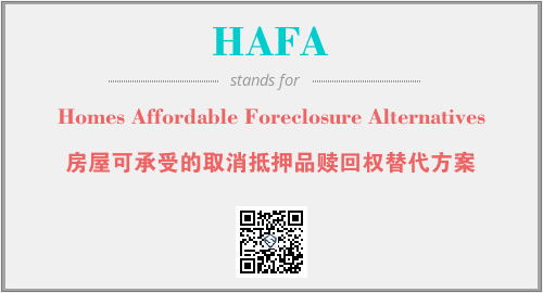 上述内容是“Homes Affordable Foreclosure Alternatives”作为“HAFA”的缩写,解释为“房屋可承受的取消抵押品赎回权替代方案”时的信息,以及英文缩略词HAFA所代表的英文单词,其对应的中文拼音、详细解释以及在英文中的流行度和相关分类、应用领域及应用示例等。
