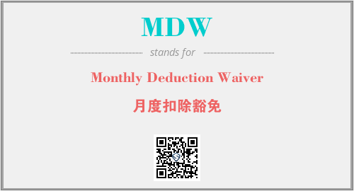 上述内容是“Monthly Deduction Waiver”作为“MDW”的缩写,解释为“月度扣除豁免”时的信息,以及英文缩略词MDW所代表的英文单词,其对应的中文拼音、详细解释以及在英文中的流行度和相关分类、应用领域及应用示例等。