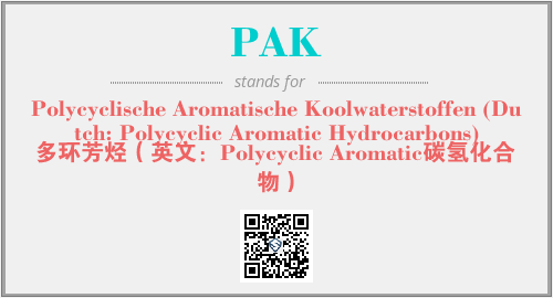 上述内容是“Polycyclische Aromatische Koolwaterstoffen (Dutch: Polycyclic Aromatic Hydrocarbons)”作为“PAK”的缩写,解释为“多环芳烃(英文:Polycyclic Aromatic碳氢化合物)”时的信息,以及英文缩略词PAK所代表的英文单词,其对应的中文拼音、详细解释以及在英文中的流行度和相关分类、应用领域及应用示例等。