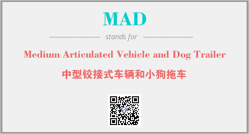 上述内容是“Medium Articulated Vehicle and Dog Trailer”作为“MAD”的缩写,解释为“中型铰接式车辆和小狗拖车”时的信息,以及英文缩略词MAD所代表的英文单词,其对应的中文拼音、详细解释以及在英文中的流行度和相关分类、应用领域及应用示例等。