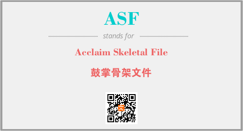 上述内容是“Acclaim Skeletal File”作为“ASF”的缩写,解释为“鼓掌骨架文件”时的信息,以及英文缩略词ASF所代表的英文单词,其对应的中文拼音、详细解释以及在英文中的流行度和相关分类、应用领域及应用示例等。
