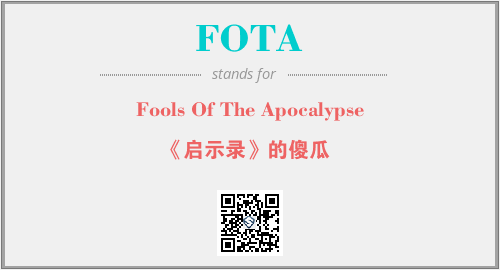 上述内容是“Fools Of The Apocalypse”作为“FOTA”的缩写,解释为“《启示录》的傻瓜”时的信息,以及英文缩略词FOTA所代表的英文单词,其对应的中文拼音、详细解释以及在英文中的流行度和相关分类、应用领域及应用示例等。