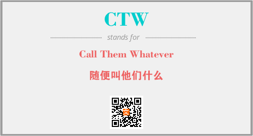 上述内容是“Call Them Whatever”作为“CTW”的缩写,解释为“随便叫他们什么”时的信息,以及英文缩略词CTW所代表的英文单词,其对应的中文拼音、详细解释以及在英文中的流行度和相关分类、应用领域及应用示例等。