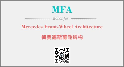 英文缩略词“MFA”经常作为“Mercedes Front-Wheel Architecture”的英文缩写来使用,中文表示:“梅赛德斯前轮结构”。本文将详细介绍英文缩写词MFA所代表英文单词,其对应的中文拼音、详细解释以及在英语中的流行度。此外,还有关于缩略词MFA的分类、应用领域及相关应用示例等。