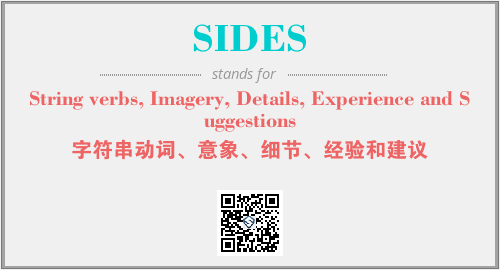 上述内容是“String verbs, Imagery, Details, Experience and Suggestions”作为“SIDES”的缩写,解释为“字符串动词、意象、细节、经验和建议”时的信息,以及英文缩略词SIDES所代表的英文单词,其对应的中文拼音、详细解释以及在英文中的流行度和相关分类、应用领域及应用示例等。