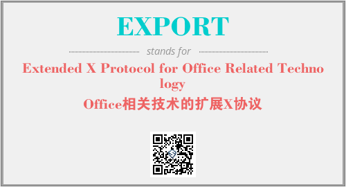 上述内容是“Extended X Protocol for Office Related Technology”作为“EXPORT”的缩写,解释为“Office相关技术的扩展X协议”时的信息,以及英文缩略词EXPORT所代表的英文单词,其对应的中文拼音、详细解释以及在英文中的流行度和相关分类、应用领域及应用示例等。