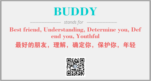 上述内容是“Best friend, Understanding, Determine you, Defend you, Youthful”作为“BUDDY”的缩写,解释为“最好的朋友,理解,确定你,保护你,年轻”时的信息,以及英文缩略词BUDDY所代表的英文单词,其对应的中文拼音、详细解释以及在英文中的流行度和相关分类、应用领域及应用示例等。