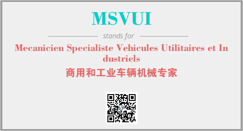 上述内容是“Mecanicien Specialiste Vehicules Utilitaires et Industriels”作为“MSVUI”的缩写,解释为“商用和工业车辆机械专家”时的信息,以及英文缩略词MSVUI所代表的英文单词,其对应的中文拼音、详细解释以及在英文中的流行度和相关分类、应用领域及应用示例等。